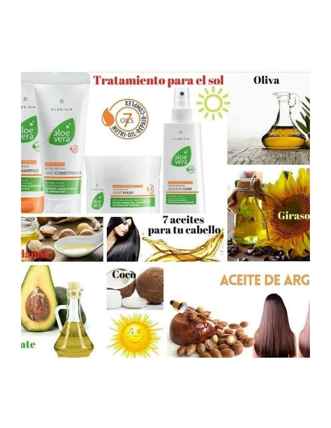 - Con un 15% gel de Aloe Vera y Nutri Oil Repair Complejo de 7 aceites (ricino, cítrico, semilla de girasol, coco, aguacate, oliva, macadamia).